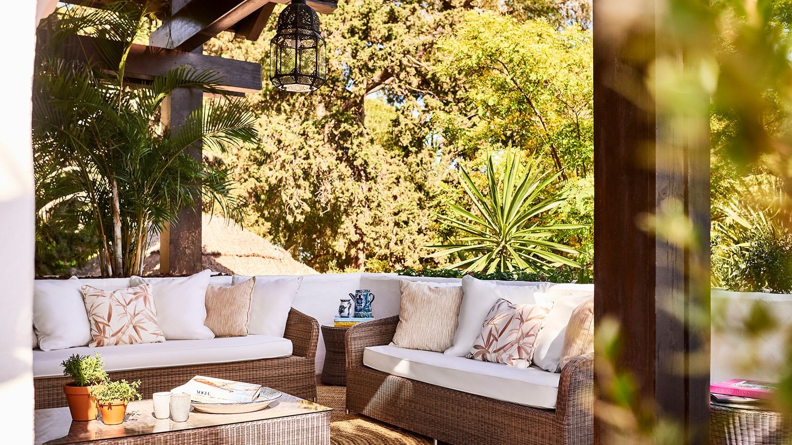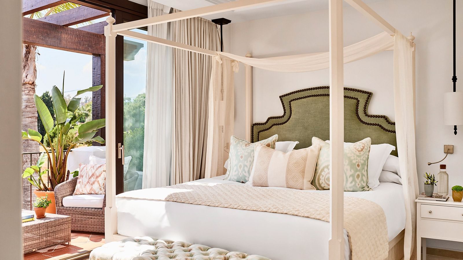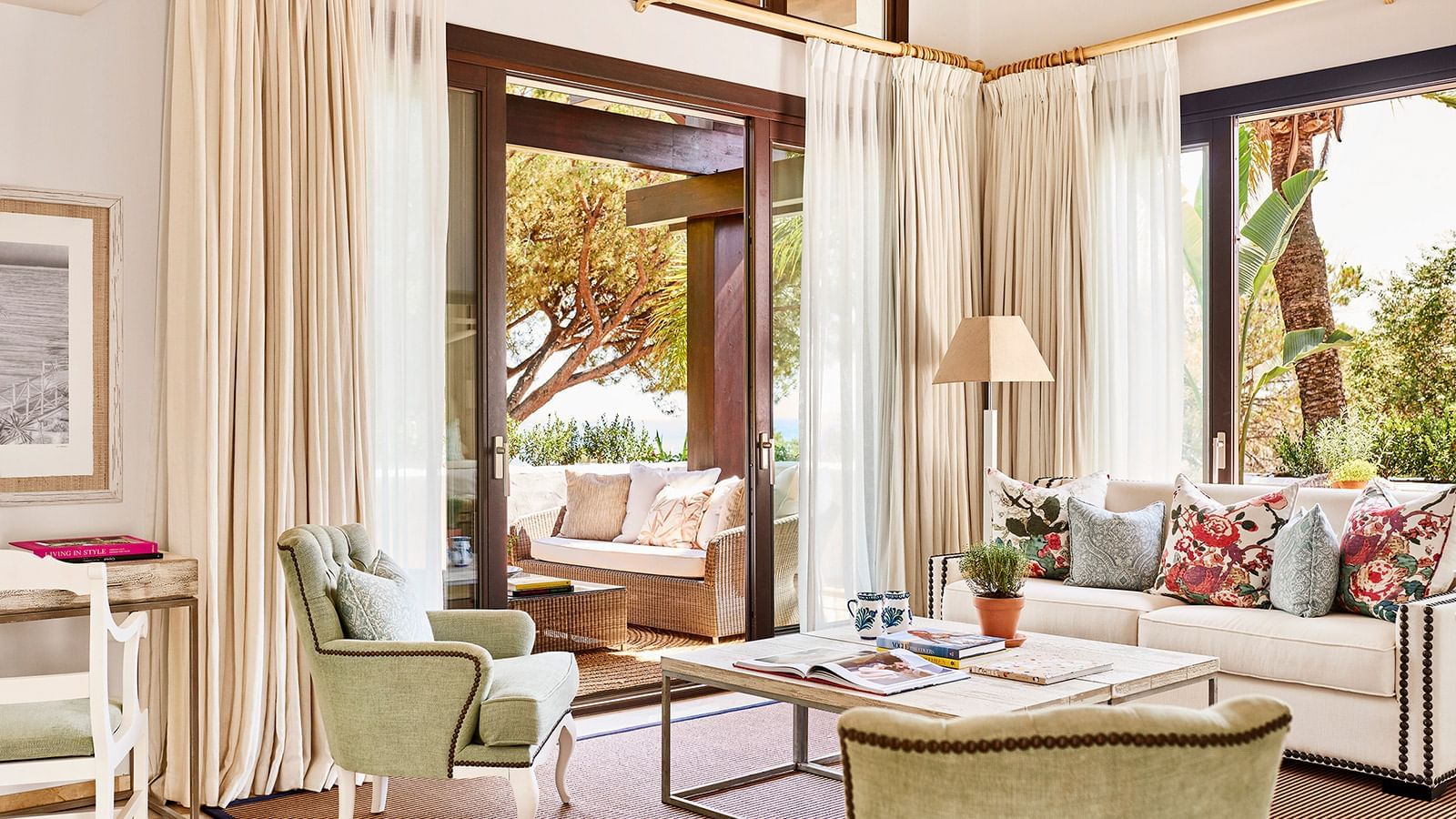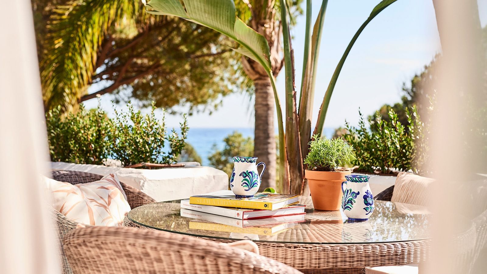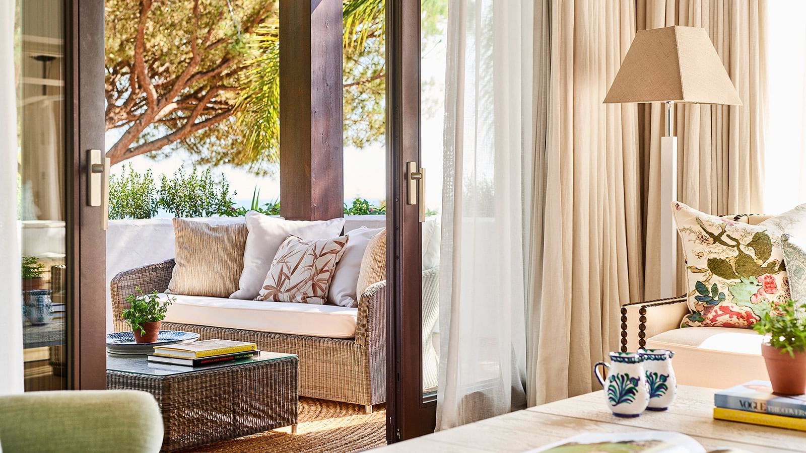 Tiempo para retirarse a esta encantadora suite, espaciosa y alegre, con techos abovedados y amplias terrazas exteriores con vistas a la naturaleza y el mar Mediterráneo como fondo.